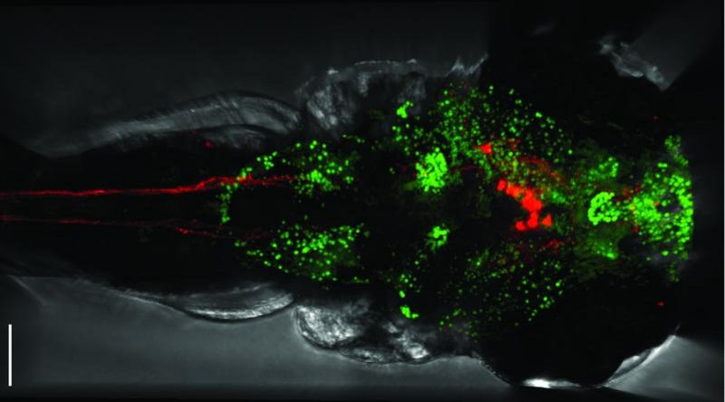 Rückenansicht einer Zebrafischlarve: Aktive Nervenzellen sind grün, Hypocretine herstellende Neurone und ihre Ausläufer rot dargestellt.