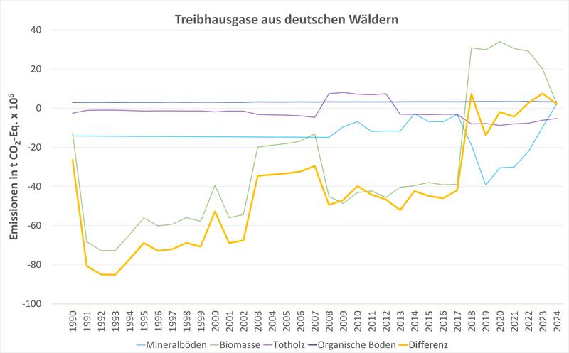 Derzeit ist beinahe so viel Kohlenstoff in der oberirdischen Biomasse der Wälder wie in deren Böden gespeichert: insgesamt rund 2.200 Millionen Tonnen Kohlenstoff oder 197,4 Tonnen Kohlenstoff je Hektar. In den lebenden Bäumen sind 1.184 Millionen Tonnen Kohlenstoff oder 108 Tonnen Kohlenstoff je Hektar gespeichert, in Streu und Mineralböden bis 30 Zentimeter Tiefe 936 Millionen Tonnen Kohlenstoff. Als Totholz sind 46,1 Millionen Tonnen Kohlenstoff (4,2 Tonnen Kohlenstoff je Hektar) gebunden. Alle Zahlen basieren auf Daten der Bundeswaldinventur 2022 und der Modellierung der aktuellen Bodenzustandserhebung (BZE II).