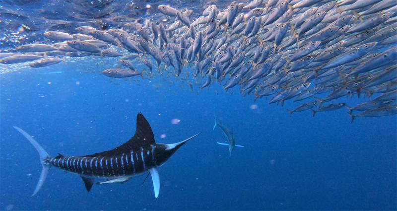 Ein gestreifter Marlin macht Jagd auf einen Fischschwarm. Bild: Matthew Hansen