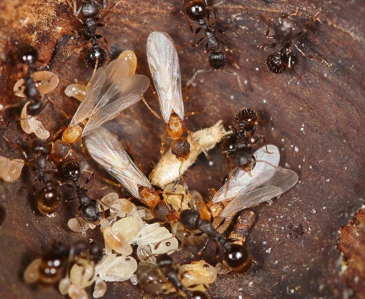 Nest mit mehreren hellbraunen, geflügelten Jungköniginnen von T. kinomurai, dunkelbraunen Wirtsarbeiterinnen der Art T. makora und Brut.