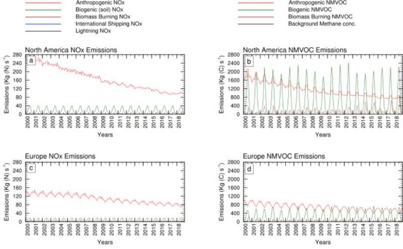 Zeitreihen der NOx-Emissionen (links) und VOC-Emissionen (rechts) für Nordamerika und Europa. © Tabish Ansari et al.