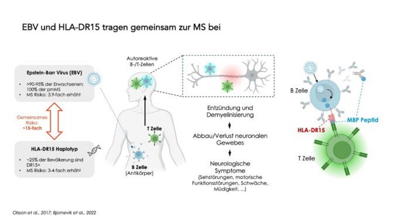 Ein Forschungsteam am Institut für Experimentelle Immunologie der Universität Zürich (UZH) hat nun neue Ergebnisse vorgelegt, die zeigen, wie das Epstein-Barr-Virus zusammen mit einer für MS typischen Genvariante zur Auslösung der Krankheit beiträgt. Die Forschungsarbeiten unter der Leitung von Roland Martin wurden zusammen mit Wissenschaftlern in Hefei, China, der Universität Tübingen und dem Imperial College in London durchgeführt.