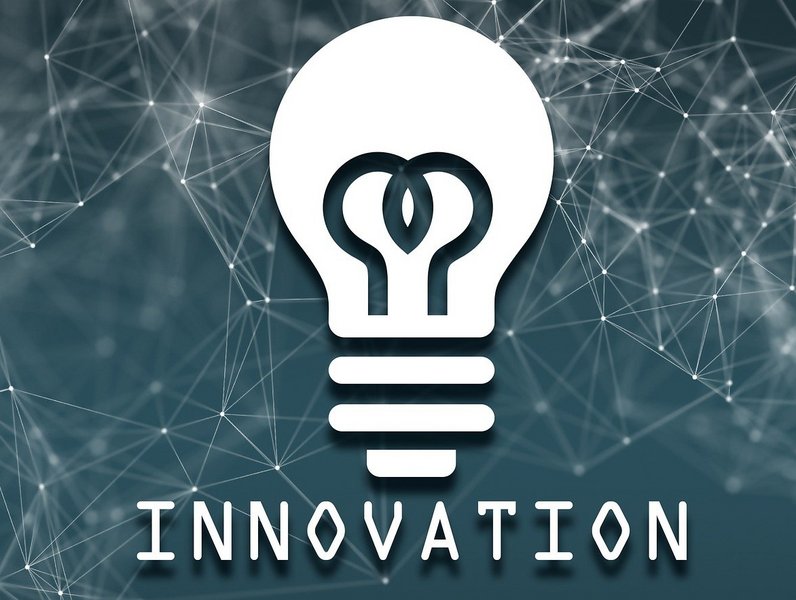 Glühbirne vor symbolischem Netzwer. Schriftzug "Innovation"