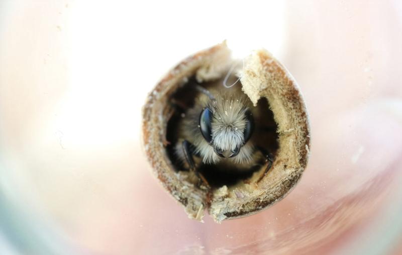 Eine rote Mauerbiene (Osmia bicornis) in ihrem Winterquartier, einem Schilfhalm. Sie ist frisch geschlüpft und schickt sich an, das Nest zu verlassen. Quelle: Cristina Ganuza