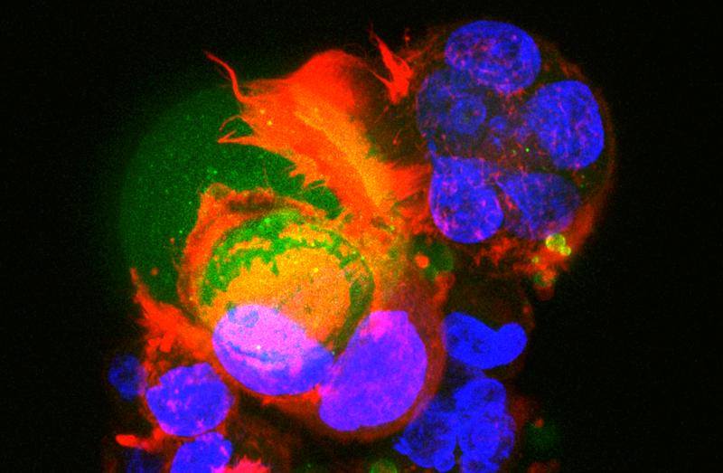 Krebszellen (rot und blau) binden eng an eine synthetische Immunzelle (grün). Es entsteht eine Hybrid-Zellkultur. Copyright: Nils Piernitzki/INM