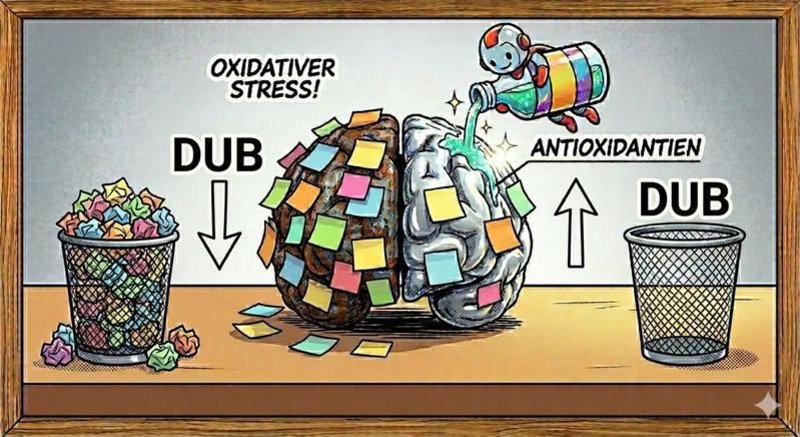Oxidativer Stress hemmt im alternden Gehirn die Aktivität von Deubiquitylasen – Enzyme, die für die Regulation des Proteinabbaus essenziell sind. Dadurch werden Ubiquitin-Markierungen an Proteinen nicht mehr effizient entfernt. Dies beeinträchtigt die Funktion des Proteasoms, der zentralen proteolytischen Abbaumaschinerie der Zelle. Bemerkenswert ist, dass dieser Effekt reversibel ist: Die Enzymaktivität kann in vivo durch Antioxidantien wiederhergestellt werden. Eine aktuelle Studie zeigt, dass die durch oxidativen Stress vermittelte Proteinoxidation ein reversibler chemischer Prozess im alternden Gehirn ist.