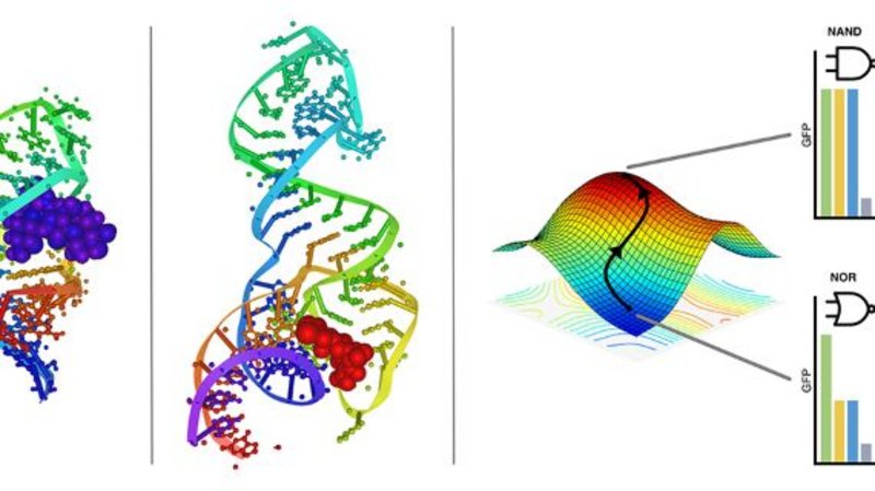 "Wir nutzen diese auf RNA basierenden Dual-Input-Schalter, um logische Funktionen wie im Computer in lebenden Zellen zu realisieren“, so Kelvin. „Dafür haben wir eine Kombination aus zwei Riboswitches konstruiert, die wie ein boolesches NAND-Gatter funktioniert." In der Digitaltechnik liefert ein NAND-Gatter nur dann ein „Aus“, wenn beide Eingaben „An“ sind – in allen anderen Fällen bleibt das Signal „Ein“. Übertragen auf die Biologie bedeutet das: Nur wenn beide Liganden gleichzeitig an den Riboswitch binden, wird die Genexpression abgeschaltet. Fehlt auch nur einer der beiden Liganden, bleibt das Gen aktiv. Ein solches Verhalten ist komplex und bisher in der Natur nicht bekannt. Hinzu kommt, dass die Anzahl unterschiedlicher Sequenzvarianten exponentiell mit der Sequenzlänge wächst. Die Konstruktion dieses hybriden NAND Riboswitch war daher eine große Herausforderung. Mit Hilfe einer Kombination aus Hochdurchsatz-Laborscreening und Bayesscher Optimierung, einem speziellen KI-Verfahren, wurde ein NAND-Gatter anhand von Computermodellen neu entworfen.
