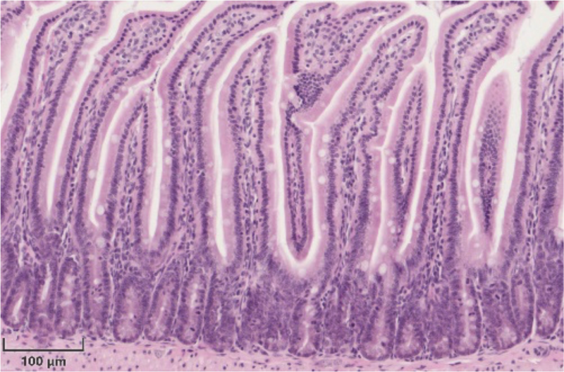 Hämatoxylin-Eosin-Färbung des Dünndarms einer gesunden Maus.