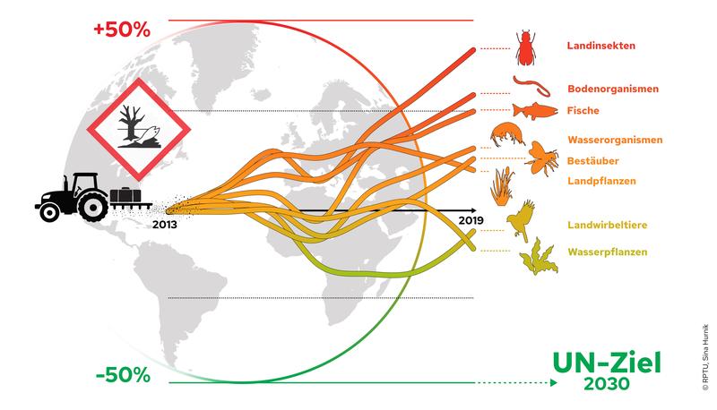 Ansteigende Trends der applizierten Pestizidgiftigkeit stehen der Erreichung der globalen UN-Ziele zur Sicherung der Biodiversität entgegen. Copyright: RPTU, Sina Hurnik