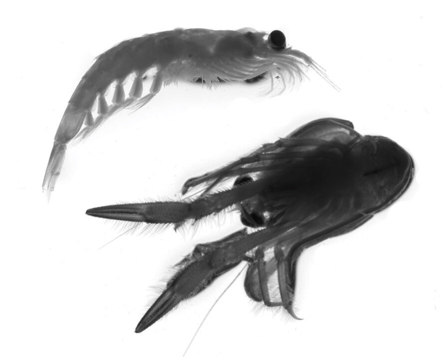 Die Zooplanktonarten Euphausia (oben) und Pleuroncodes (unten) aus der Sauerstoffminimum-Zone. Beide Arten führen Vertikalwanderungen durch und verweilen tagsüber in der Sauerstoffminimum-Zone. Foto: Helena Hauss, GEOMAR