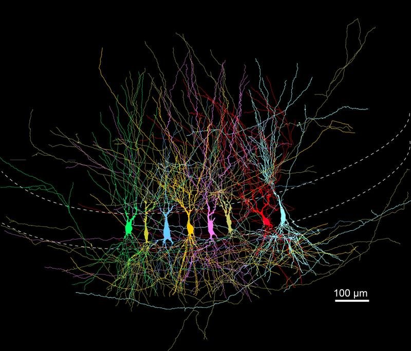 Collage von CA3-Pyramiden-Neuronen. Die mit Biocytin – einem Tracer, der sie während der Aufzeichnung markiert – gefüllten Neuronen werden fixiert und gefärbt, um eine vollständige Rekonstruktion ihrer Formen zu ermöglichen. Copyright: © Jose Guzman / ISTA Jonas Gruppe