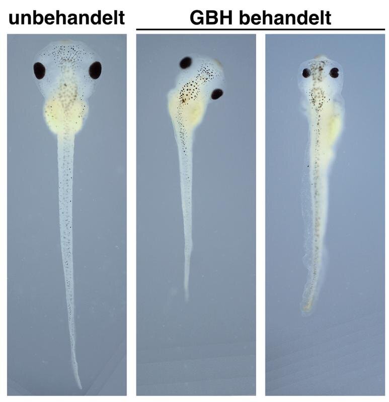 Kaulquappen des Südafrikanischen Krallenfrosches. Die Behandlung mit einem Glyphosat-basierten Herbizid (GBH) führt zu Defekten während der Embryonalentwicklung der Froschembryonen (rechts). Unbehandelte Embryonen entwickeln sich dagegen normal (links) Hannah Flach, Universität Ulm