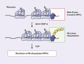 Forschende entdecken einen neuen Weg für den Abbau von RNA-Protein-Crosslinks, die durch toxische Aldehyde verursacht wurden. Abb./©: Suryo Rahmanto et al., K6-linked ubiquitylation marks formaldehyde-induced RNA-protein crosslinks for resolution, Molecular Cell (2023)