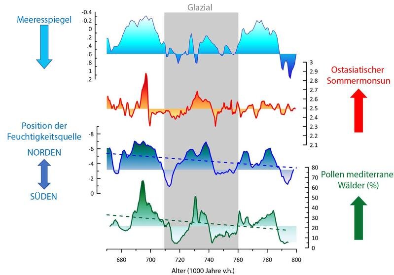 Für ihre Untersuchungen nutzten die Forscherinnen und Forscher neue klimatische Aufzeichnungen aus einem vor Portugal gewonnenen Bohrkern sowie Lößaufzeichnungen des chinesischen Plateaus. Diese Daten wurden für Computersimulationen herangezogen. Sie zeigen für den Zeitraum der vergangenen 800.000 bis 670.000 Jahre einen langfristigen Trend zu wärmeren und feuchteren Bedingungen in beiden subtropischen Regionen. Zugleich waren während dieser letzten Eiszeit in der Periode des „Mittelpleistozänen Übergangs“ die Temperaturen der Meeresoberflächen im Nordatlantik und im tropischen Nordpazifik höher als im vorangegangenen Interglazial, der Phase zwischen zwei Eiszeiten. Dies führte zu einer höheren Feuchtigkeitsproduktion und vermehrten Niederschlägen in Südwesteuropa, der Ausbreitung mediterraner Wälder sowie einem verstärkten Sommermonsun im ostasiatischen Raum. Die Feuchtigkeit gelangte zudem in die Polargebiete, wo sie die Eisschilde im nördlichen Eurasien wachsen ließ. „Sie hatten länger Bestand und läuteten die bis ins späte Pleistozän anhaltende Phase ausdauernder und weitreichender eiszeitlicher Vergletscherungen ein. Die Vergrößerung der kontinentalen Gletscher war dabei eine Voraussetzung, um den Übergang von den 40.000-jährigen Zyklen zu den 100.000-jährigen Zyklen, die wir heute erleben, auszulösen. Dies stellte einen entscheidenden Schritt in der jüngeren Klimaentwicklung der Erde dar“, so André Bahr.