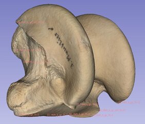 3D Ansicht des linken Talus (Sprungbeinknochen) eines Maultieres (männlich, kastriert) aus der Staatssammlung für Paläoanatomie München. Michaela Zimmermann, LMU