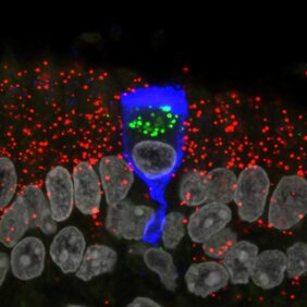 Die Frankfurter Forscher unter der Leitung der Wissenschaftlerin Mona Khan färbten anschließend mit speziell entwickelten Sonden Schnitte der Gewebeproben an und analysierten sie unter einem konfokalen Mikroskop. Mit der ultrasensitiven Analysemethode, auch RNAscope genannt, können verschiedene Arten von RNA-Molekülen von Sars-CoV-2 innerhalb einzelner Zellen sichtbar gemacht werden. Durch die gleichzeitige Visualisierung und farbliche Unterscheidung der für die verschiedenen Zelltypen charakteristischen RNA-Moleküle in Kombination mit der klassischen Zellfärbung durch Antikörper konnten die Wissenschaftler die infizierten Zellen bestimmten Zelltypen zuordnen. "Unsere Ergebnisse zeigen, dass Sars-CoV-2 Stützzellen im Riechepithel von Covid-19-Patienten infiziert und sich in diesen Zellen stark vermehrt", sagt Peter Mombaerts, Direktor der Max-Planck-Forschungsstelle für Neurogenetik. Die Analyse von Schnitten der Riechschleimhaut eines Covid-19-Patienten mit einem neuartigen Ansatz der Ganztranskriptomanalyse unter Verwendung des Digital Spatial Profiler von NanoString Technologies ergab zudem, dass die Infektion der Stützzellen die Aktivität von Genen für Geruchsrezeptoren in den nahe gelegenen Riechsinneszellen nicht verändert.