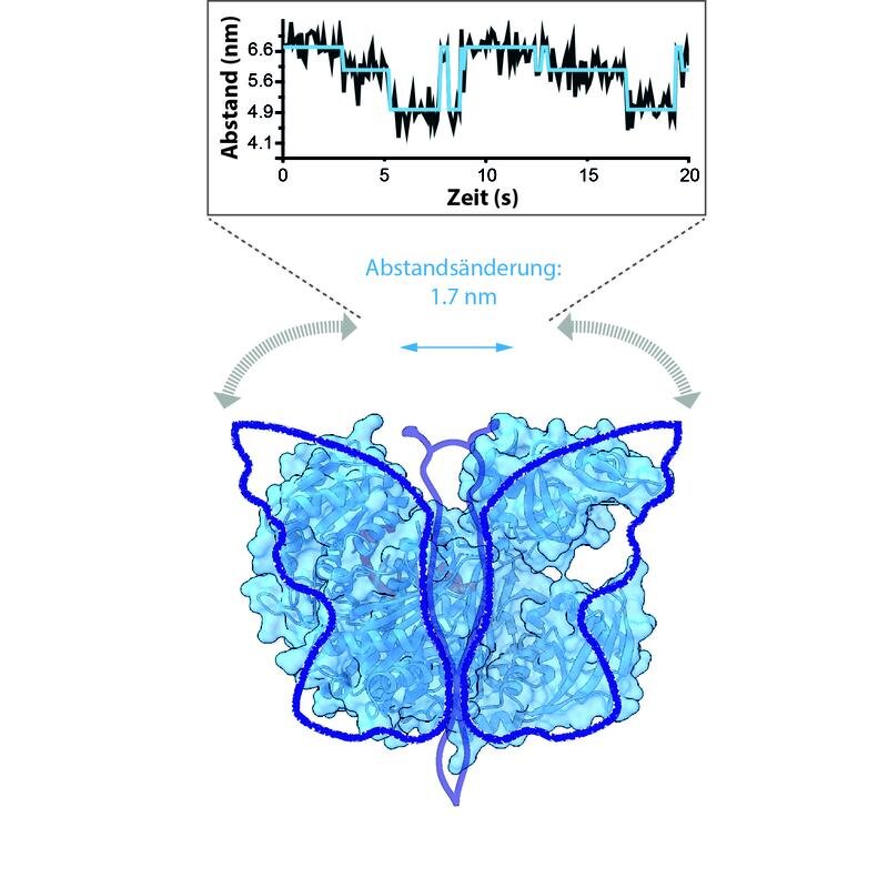 Dass Argonaute2 aus zwei „Proteinflügeln“ aufgebaut ist, wusste man schon lange. Dem Team ist es nun aber gelungen, einen Farbstoff ortsspezifisch in die jeweiligen Flügel des Argonaute2-Proteins zu koppeln, was eine Grundvoraussetzung für zeitaufgelöste FRET-Messungen ist. Mit FRET kann man den Abstand zwischen diesen Farbstoffen mit Nanometerpräzision vermessen. Dazu nutzt man die Möglichkeit, dass einer der Farbstoff gezielt angeregt werden und dann seine Energie auf den benachbarten Farbstoff übertragen kann, sodass ein Lichtsignal des benachbarten Farbstoffes detektiert werden kann. Die Effizienz dieses Energietransfers zwischen den Farbstoffen hängt direkt vom Abstand der Farbstoffe ab. Mithilfe dieser FRET-Technik konnte das Team nun in Echtzeit unter dem Mikroskop beobachten, dass die Proteinflügel von Argonaute ähnlich wie bei einem Schmetterling auf- und zuklappen. Sobald jedoch Argonaute eine kleine RNA bindet, arretieren die Flügel in einer Position. Der Flügelschlag beträgt dabei nur knapp zwei Nanometer. Eine Beobachtung der Dynamik von humanen Argonaute2 war in dieser Weise noch keiner Gruppe auf der Welt gelungen. Die Studie zeigt außerdem, dass eines der Enden der kleinen gebundenen RNA bei Bindung einer komplementären Boten-RNA von einem der Argonaute-Flügel entlassen wird. Soll der Argonaute-RNA-Komplex in der Zelle abgebaut werden, wird dagegen der RNA Duplex in einer sehr ungewöhnlichen Konformation positioniert, sodass die RNA für Nukleasen zugänglich wird und degradiert werden kann. Auch das Argonaute2-Protein selbst wird in diesem Prozess abgebaut. Die Studie profitierte nicht zuletzt von der u.a. im SFB960 gebündelten RNA- und Argonaute-Expertise der Gruppen von Prof. Dr. Grohmann und Prof. Dr. Meister am Standort Regensburg.