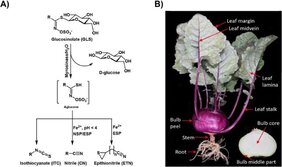 Enzymatischer Abbau von Glucosinolaten durch Myrosinase (A) nach Gewebeaufschluss verschiedener Kohlrabi-Organe (Brassica oleracea var. gongylodes cv. Kolibri) (B). Abbildung: Mbudu et al. (2024), Food Chemistry. DOI:10.1016/j.foodchem.2024.142032