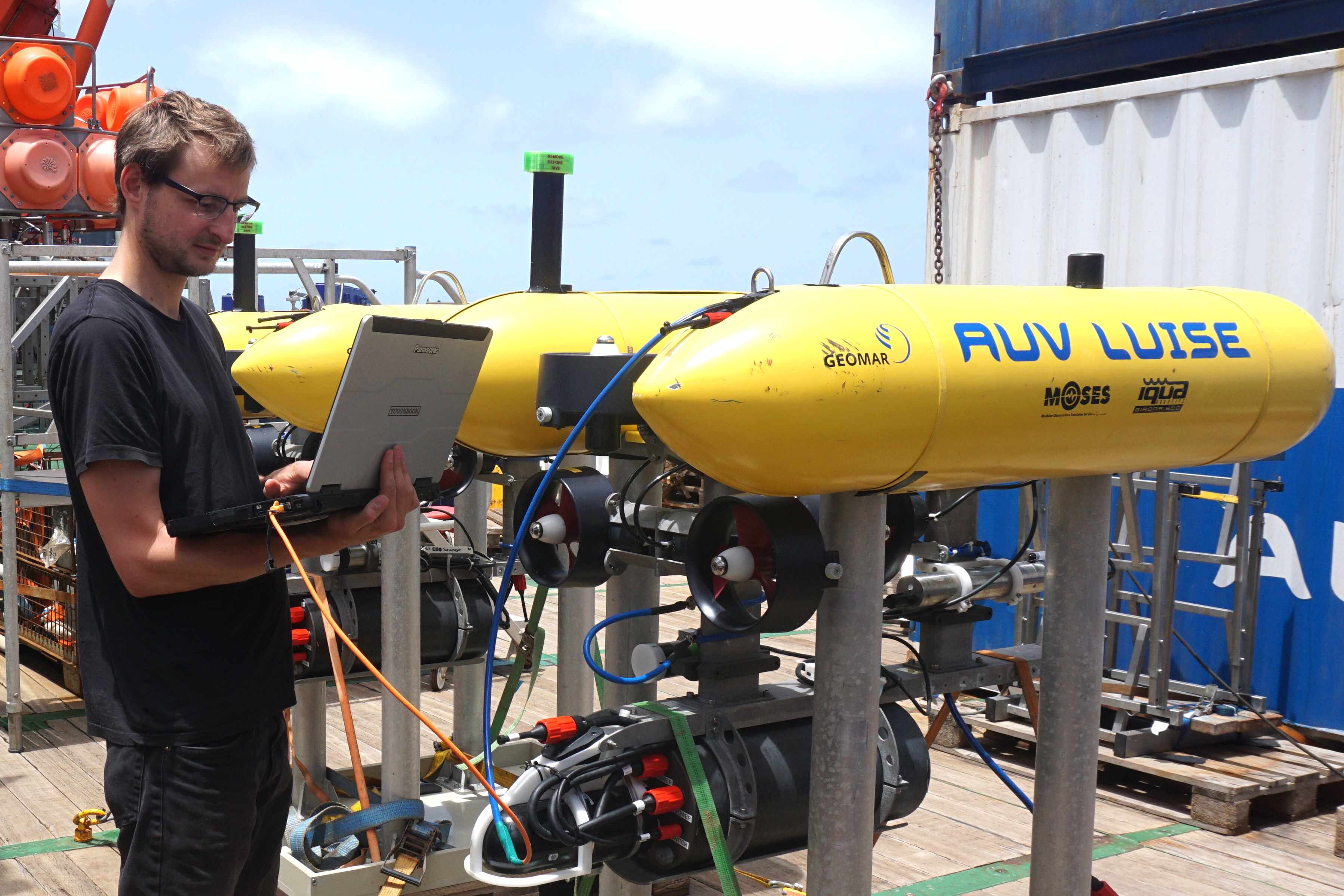 Das autonome Unterwasserfahrzeug LUISE wird an Bord des Forschungsschiffs METEOR auf einen Einsatz vorbereitet. Foto: Nis Hansen, GEOMAR