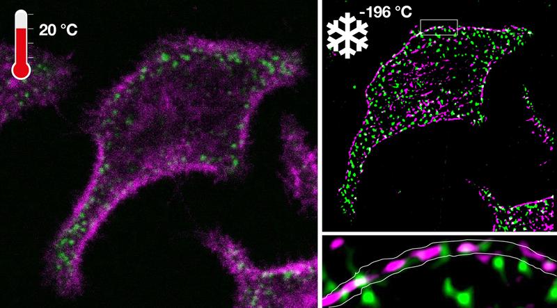 Die Fluoreszenzmikroskopie bietet die einzigartige Möglichkeit, zelluläre Prozesse über vier Größenordnungen hinweg zu beobachten. Ihre Anwendung in lebenden Zellen wird jedoch durch sehr schnelle und unaufhörliche Molekularbewegungen und durch die licht-induzierte Zerstörung der Fluoreszenzsonden fundamental eingeschränkt. Der ultraschnelle Kryo-Arrest direkt während der Beobachtung lebender Zellen unter dem Mikroskop, entwickelt von der Gruppe um Prof. Philippe Bastiaens am Max-Planck-Institut für molekulare Physiologie in Dortmund, umgeht nun diese fundamentalen Probleme und ermöglicht so die Beobachtung von molekularen Mustern des Lebens, die ansonsten unsichtbar sind.