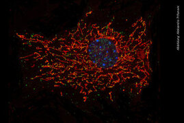 Bildgebung einer Zelle: Zellkern in blau, Mitochondrienstruktur in rot, und mitochondriale DNA in grün.