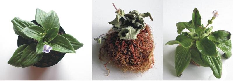 Die Wiederauferstehungspflanze Craterostigma plantagineum in bewässertem Zustand (links), ausgetrocknet (Mitte) und dann “wiederbelebt” (rechts). Foto: AG Bartels/Uni Bonn