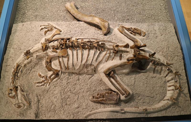 Montiertes Skelett des Plateosaurus „Fabian“ im Sauriermuseum Frick, mit dem 50 cm langen Oberschenkelknochen (Femur) eines größeren Plateosaurus als Größenvergleich. Sauriermuseum Frick, Schweiz