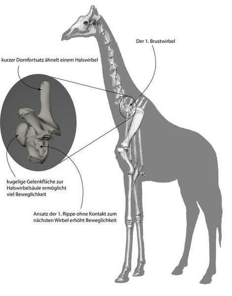 Marilena Müller (HU) unterzog die Knochen einer dreidimensionalen statistischen Gestaltanalyse. Die Gestalt des ersten Brustwirbels der Giraffe stach heraus und unterscheidet sich von anderen Paarhufern, die ebenfalls lange Hälse haben, wie beispielsweise bei der Giraffengazelle oder dem Vikunja. Obwohl der Knochen Rippen trägt und somit Teil der Brustwirbelsäule ist, ähnelt er in seiner Gestalt einem Halswirbel. In dieser Hinsicht ist die Giraffe einzigartig.