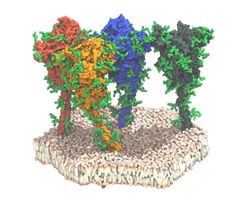Simulation von vier Spike-Proteinen (rot, orange, blau und grau) des SARS-CoV-2-Virus. Die Proteine und Lipide sind in Oberflächendarstellung dargestellt. Die schützenden Glykanketten sind grün dargestellt