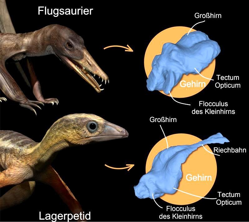 Die Rekonstruktion ergab, dass die Lagerpetiden, die nächsten Verwandten der Flugsaurier, noch sehr ursprüngliche Reptiliengehirne besaßen, ähnlich dem der frühesten Dinosaurier, die zur gleichen Zeit lebten. „Allerdings hatten sie bereits ein besseres Sehvermögen entwickelt. Ihre für das Sehsystem zuständigen Hirnlappen, das sogenannte Tectum opticum, waren vergrößert und seitlich angeordnet wie bei den Flugsauriern und den Vogelvorfahren“, sagt Bronzati. „Mit dieser Anpassung konnten sich die Lagerpetiden besser in einer baumbestandenen Umgebung zurechtfinden, und sie wird später vermutlich den Flugsauriern bei der Entwicklung des Fliegens geholfen haben.“ Insgesamt sei die Anatomie des Gehirns bei Flugsauriern und den Dinosauriervorfahren der Vögel ähnlich, berichtet der Studienautor Professor Akinobu Watanabe von der New York University von den vergleichenden Analysen. „Bei den heutigen Vögeln sieht sie hingegen anders aus.“