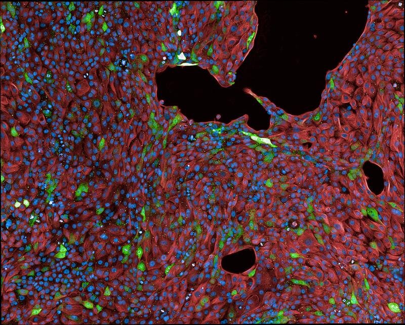 Eine Zelllinie des Lungenepithels mit Membranen (rot) und Kernen (blau). Zellen, die als Reaktion auf eine SARS-CoV-2-Infektion das fluoreszierende Protein herstellen, leuchten grün. Matthias Schmitt, AG Gargiulo, Max Delbrück Center